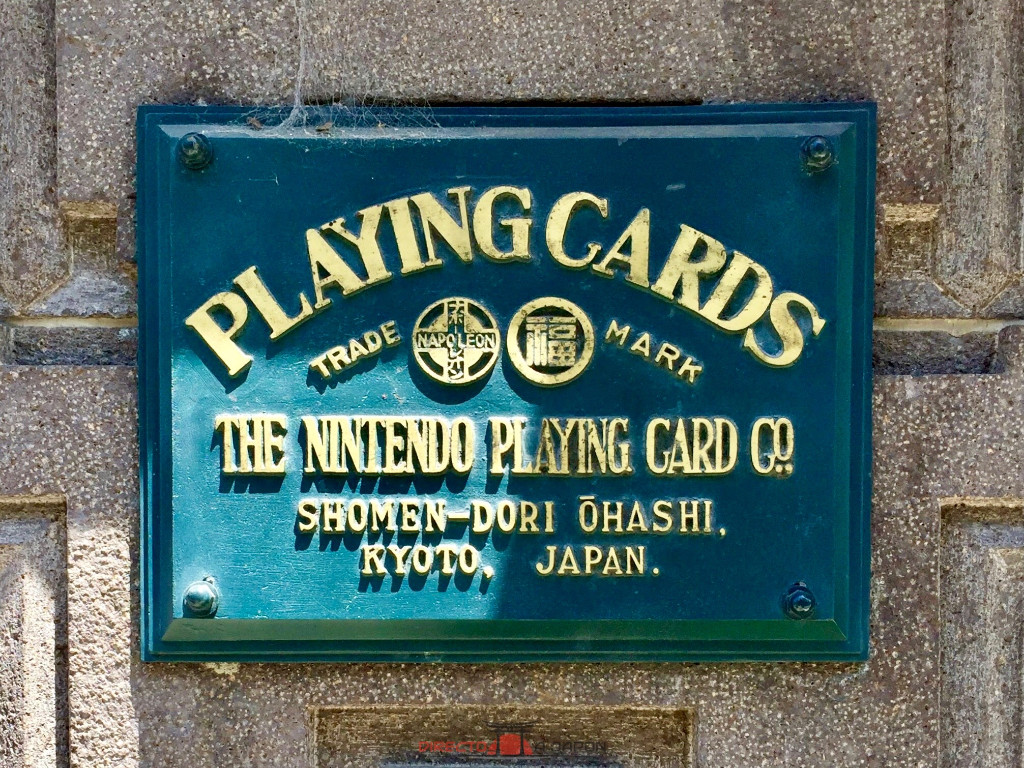 ¡Se trata de una placa conmemorativa del lugar en el que se fundó Nintendo en 1889! Nintendo empezó como una compañía que fabricaba y vendía cartas tradicionales japonesas (Hanafuda - Wikipedia). Con el paso de los años fueron metiéndose en distintos sectores, ya se sabe, adaptarse o morir. Hacían juguetes para niños, ¡e incluso tenían una compañía de taxis! Hasta que un día se metieron en el mundo de la electrónica y los videojuegos y el resto ya es historia. Esta es la otra placa que hay en el lateral derecho de la puerta. Más o menos viene a decir lo mismo pero en japonés: